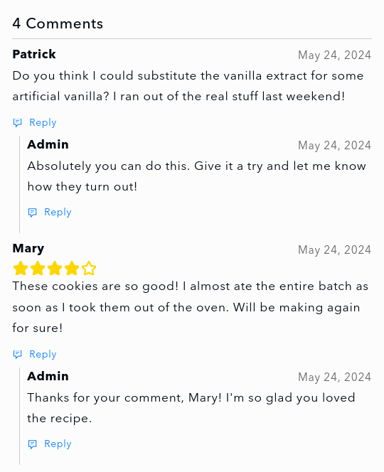 Threaded replies allow for a more organized and engaging comment section, where users can respond directly to each other’s comments. Meanwhile, the 5 star rating system gives your readers the opportunity to rate your recipe, guide, or blog post; providing great feedback about your content seamlessly.