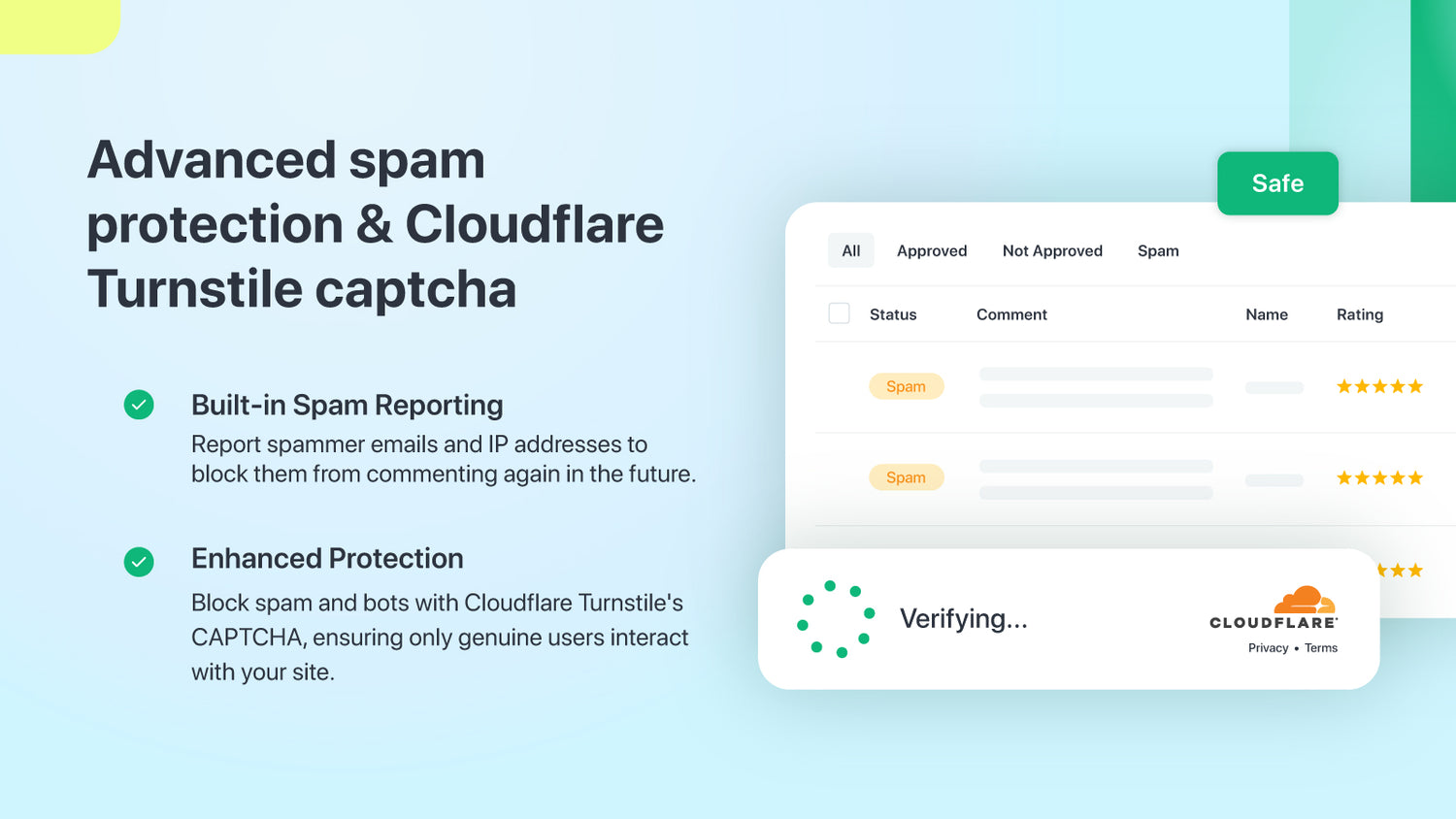For an extra layer of security, we've integrated optional Cloudflare Turnstile captcha. This modern, user-friendly captcha system effectively blocks bot comments while providing a seamless experience for your genuine readers. Unlike traditional captchas, Turnstile is designed to be unobtrusive, ensuring that your legitimate customers aren't discouraged from leaving comments.
